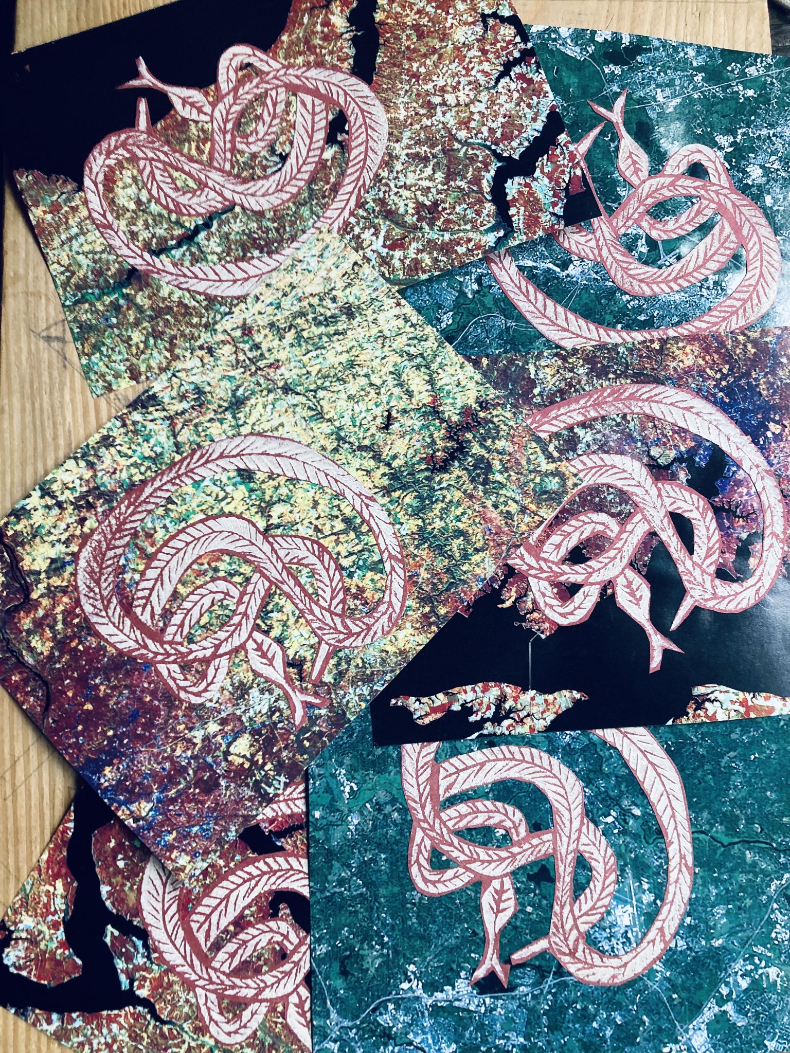 An original limited edition print by Velda Thomas. Approximately 5"x7". Printed snake on red straw paper on vintage atlas paper. Each print will vary slightly.