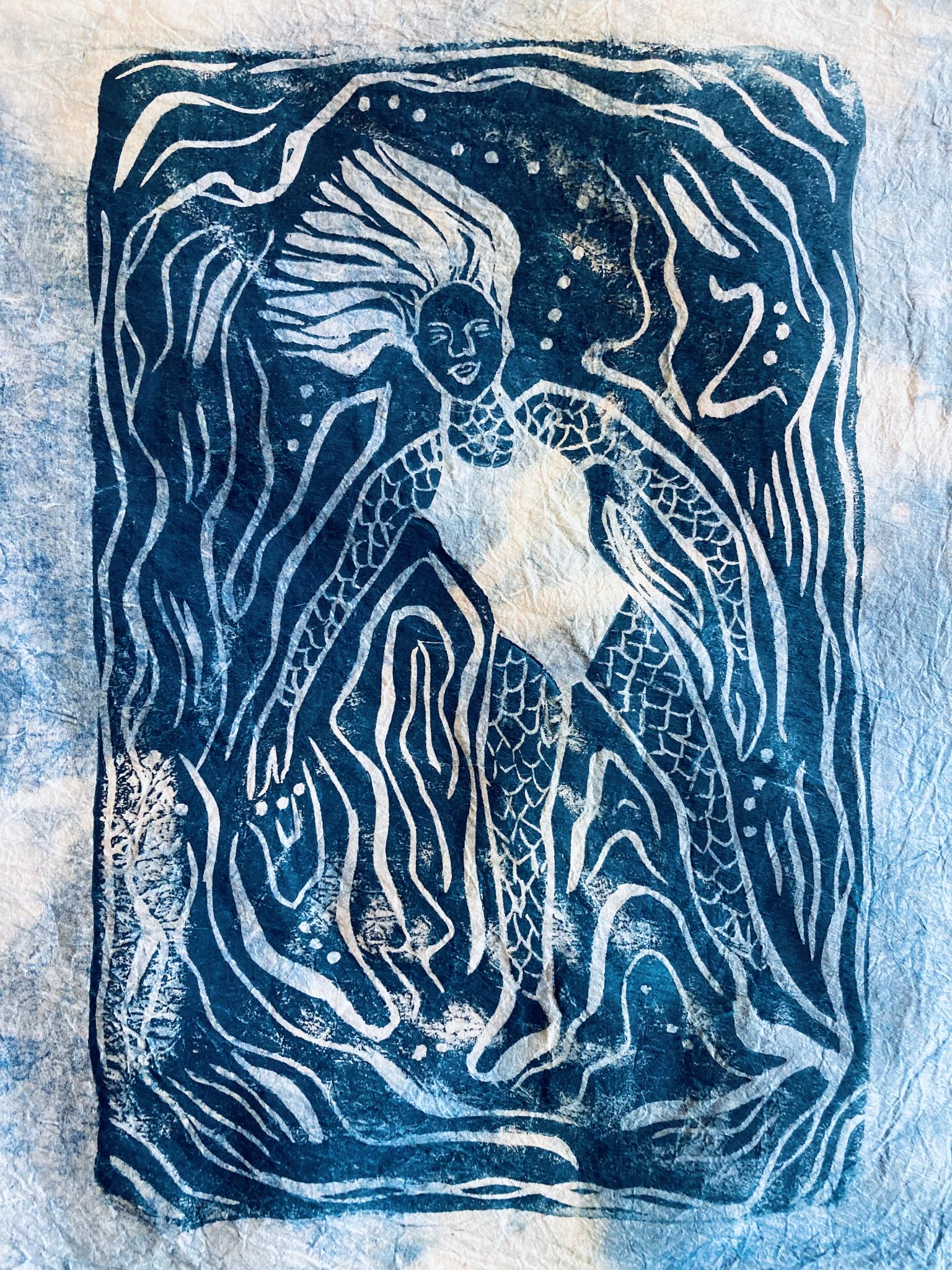 An original limited edition art print by Velda Thomas. 6"x9" block print with water based inks on on 8"x10" indigo dyed textured mulberry paper (like fabric). Colors my vary slightly from print to print.